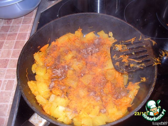 Обжарить в этом соусе тыкву и морковвь в течение 7-10 минут до появления лёгкой глазури.
