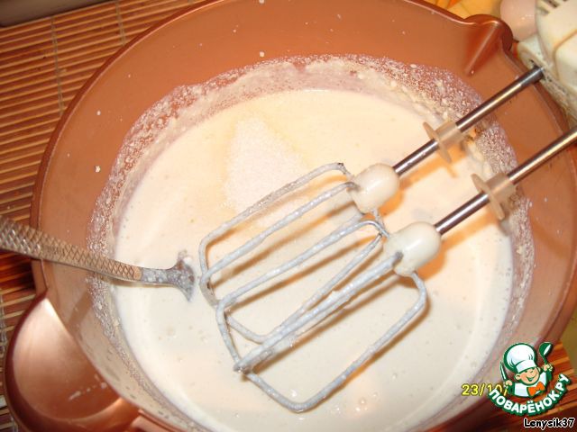 Отдельно взбить в пену белки, добавив немного сахара и соли по вкусу. Соединить белки с творожной массой, аккуратно вымешать.