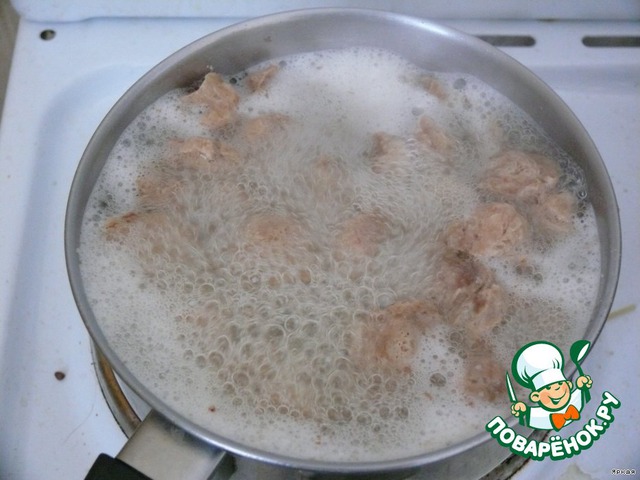 В кипящую воду положить шницель, посолить, варить 15 минут.