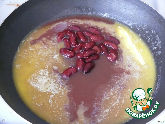 Добавить в фасоль гречку, хорошенько перемешать. Сверху выложить наш шницель.