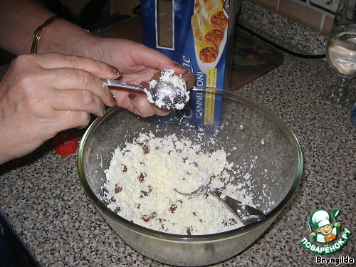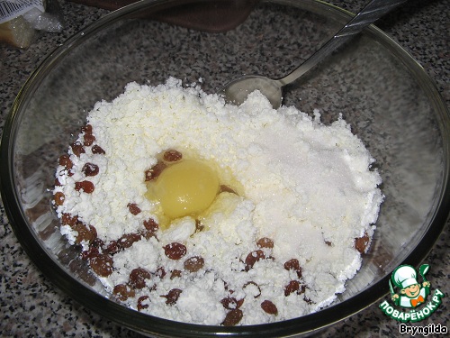 Творог растереть с сахаром, добавить изюм и яйцо и перемешать.