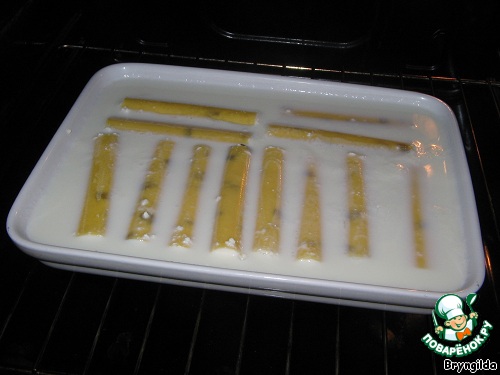 Подготовить соус. Для этого в горячее молоко или сливки насыпать немного сахара, мне хватает 1 ст. ложки (не очень сладко) и ванилин. Довести до кипения и залить каннеллони. Отправить в духовку минут на 25.