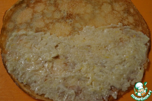 На половину блинчика намазать тонким слоем начинку.