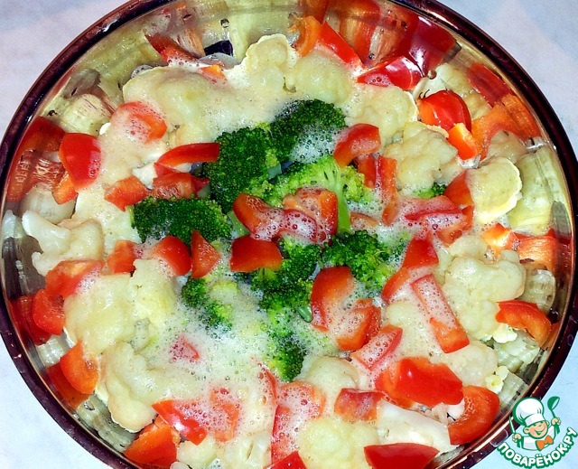 Взбила яйца в миксере и вылила в сковороду с овощами. ( Если не спешите, тогда взбейте всё по отдельности, белок и желток. )
