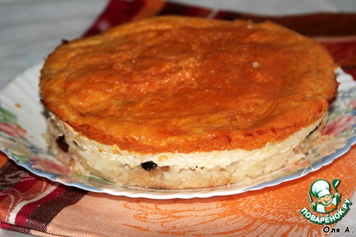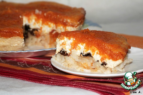 Круглую форму для выпечки смазать растительным маслом. Выложить слоями: рис-изюм-творог-тыквенное пюре. Сверху положить 25 г порезанного кусочками сливочного масла.