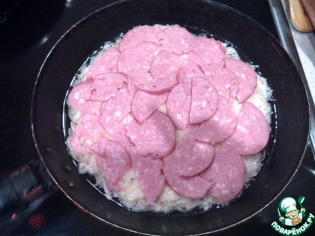 Смазываем сковороду маслом, выкладываем половину спагетти с яичной смесью, сверху - ломтики копченой колбасы.