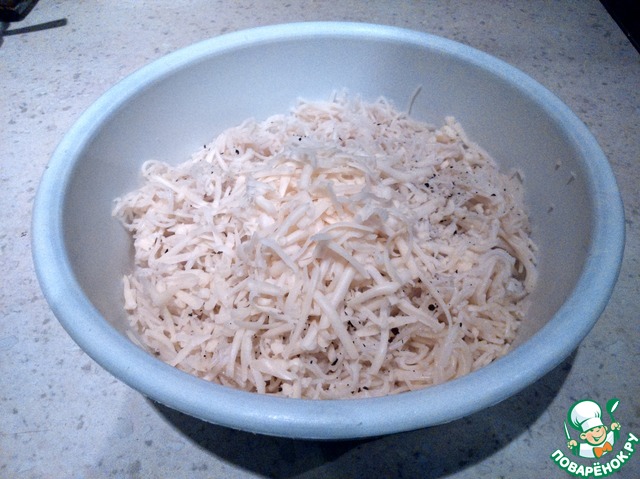 Остывшие макароны посолите, поперчите по вкусу, добавьте тертый сыр и перемешайте.