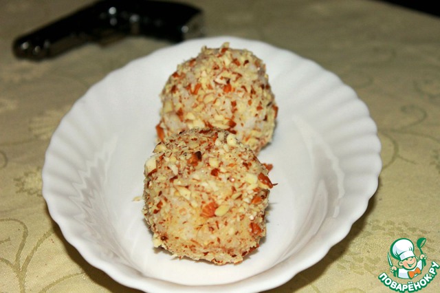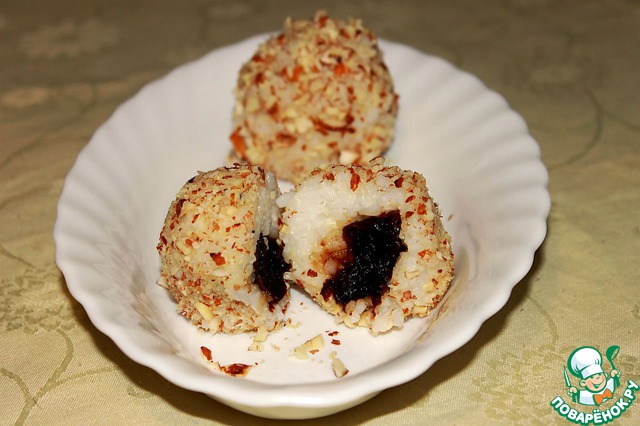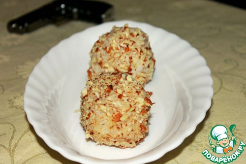Обваливаем наши рисовые шарики в порубленном миндале.