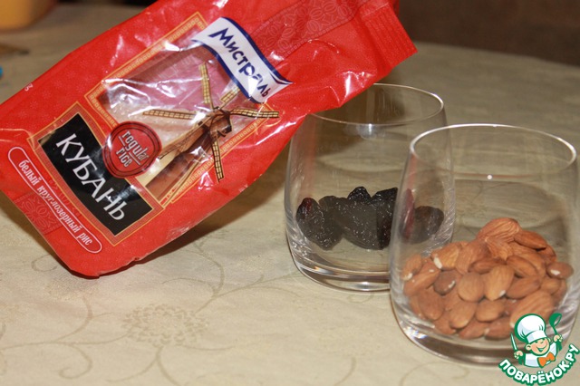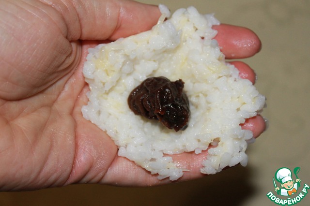 Из смеси риса и сыра формуем лепешечку, в середину вкладываем предварительно замоченный на 30 минут чернослив без косточек.
