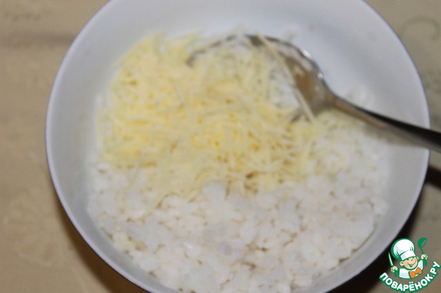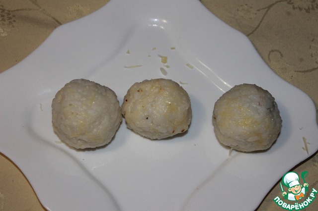 Рис варим, как указано на упаковке, чуть охлаждаем, чтоб терпимо было рукам, смешиваем с мелко натертым пармезаном. Рис при варке я не солила, так как сыр дал необходимую соль. Но мы очень мало солим еду, попробуйте свою смесь, может, на ваш вкус надо чуть присолить.