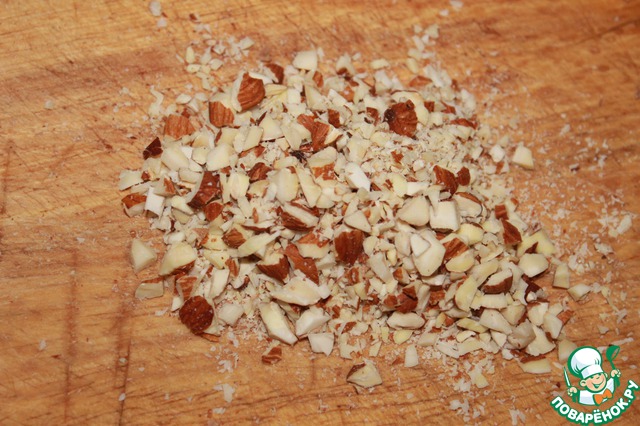 Миндаль обжариваем и мелко рубим. Этот этап мне больше всего нравится. По кухне разносится волшебный запах жареного миндаля.