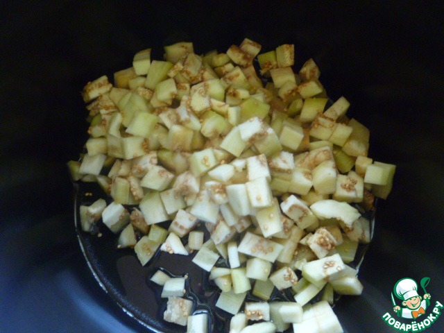 Затем баклажаны хорошо отжать и порезать на кубики, в чашу мультиварки налить растительное масло и выложить баклажаны.