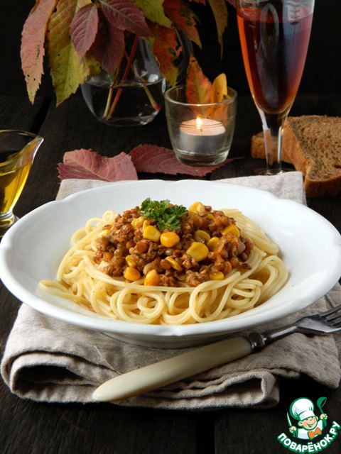 Спагетти с мясным чечевично-кукурузным соусом