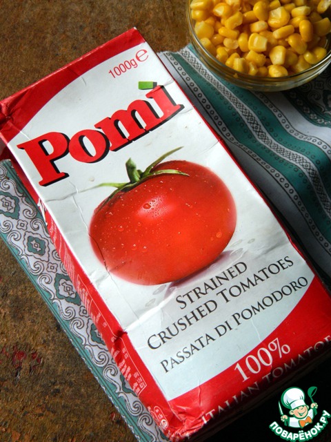 Также нам понадобятся протертые томаты, я брала томаты марки Пармалат.