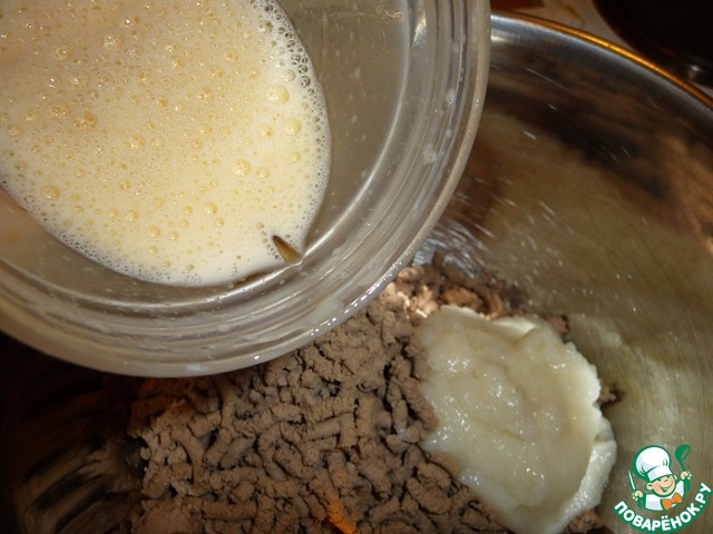 В печень добавить отварную крупу манную, яйцо взбить и добавить к массе.