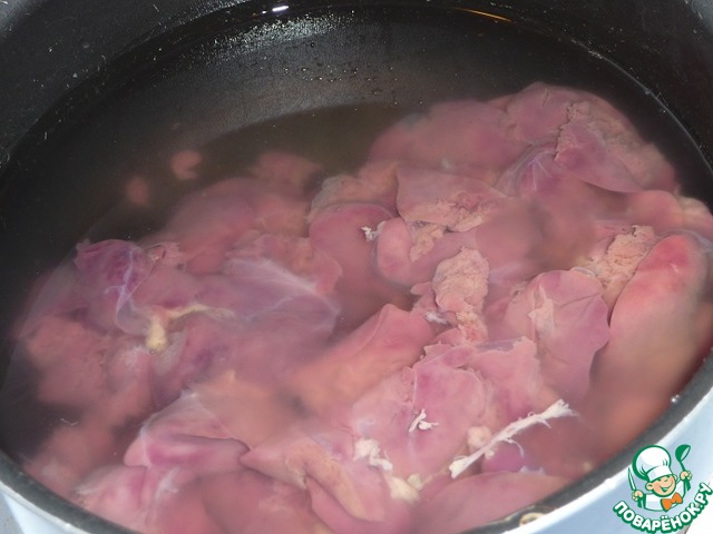 Печень промыть, отварить в подсоленной воде 10 мин.