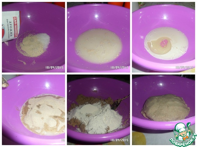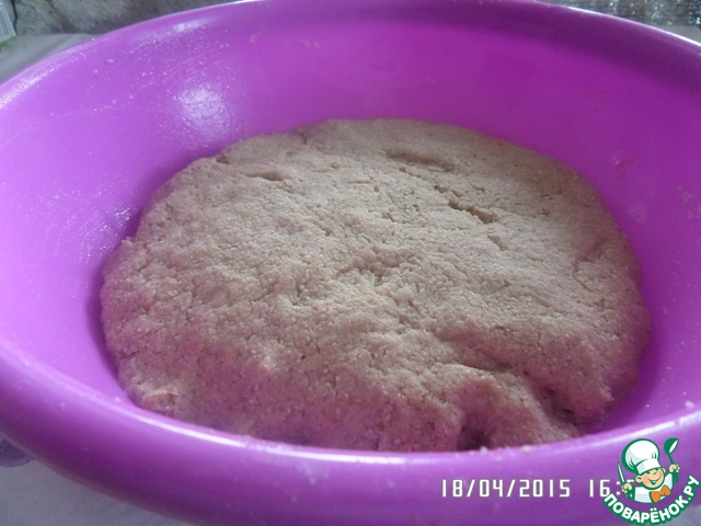 Добавляем стакан теплой воды. Оставляем на 10 минут. Затем добавляем 2 ст. л. растительного масла. Всыпаем гречневую муку. Хорошо перемешиваем. Добавляем просеянную пшеничную муку. Замешиваем тесто. Оставляем на 1 час, прикрыв полотенцем.