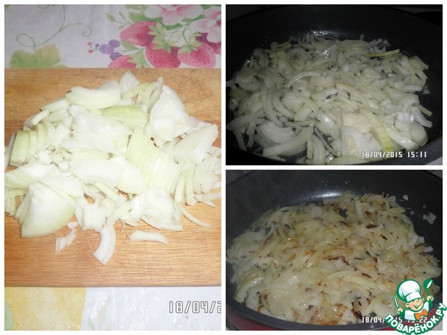Нарезаем лук. На разогретую сковороду наливаем 2 ст. л. растительного масла, выкладываем лук. Обжариваем до золотистого цвета. Остужаем.