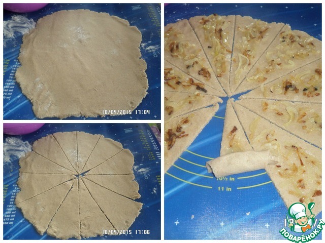 На рабочей поверхности раскатываем 1 часть теста лепешкой. Делим на треугольники, на каждый выкладываем обжаренный лук. Сворачиваем от края к центру, чтобы получился рогалик. Также поступаем со второй частью теста.