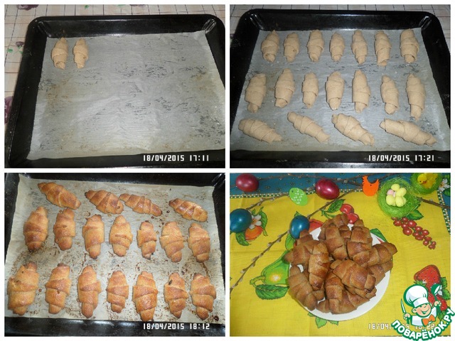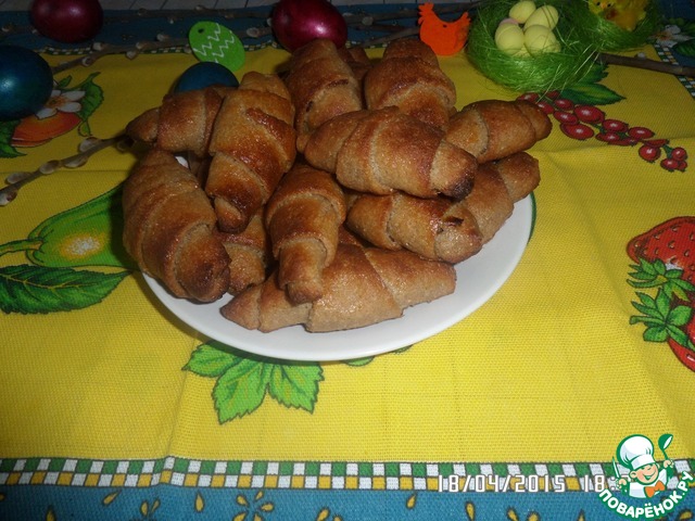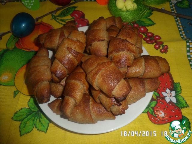 Выкладываем рогалики на противень, застеленный пергаментом. Выпекаем 20-30 минут при 150-180 градусах. За 10 минут до окончания выпечки смазать желтком.