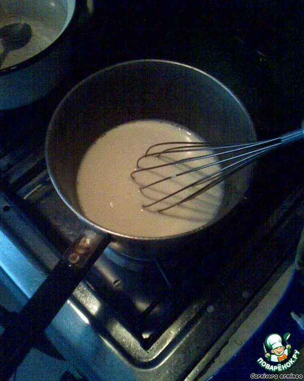 Влить горячее молоко в муку и оставить на маленьком огне до загустения, непрерывно помешивая