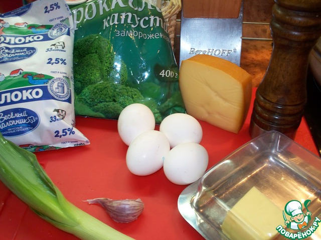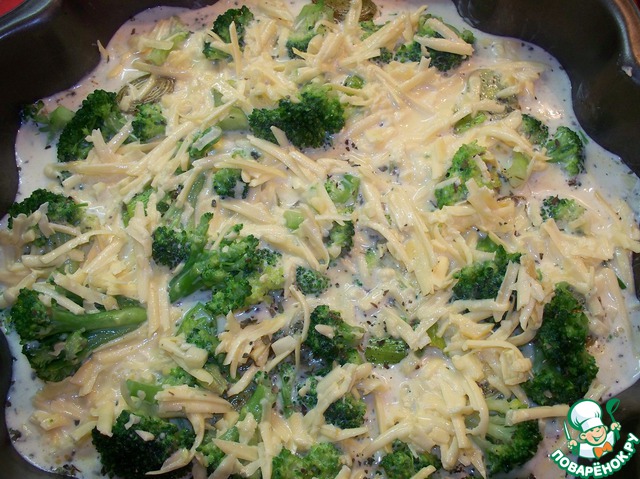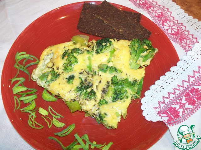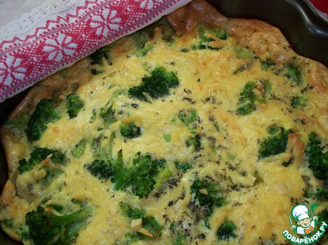 Дно противня слегка смазываем маслом. Выкладываем лук-порей, брокколи, добавляем базилик. Заливаем все взбитой смесью. Ставим в горячую духовку на 15 минут.