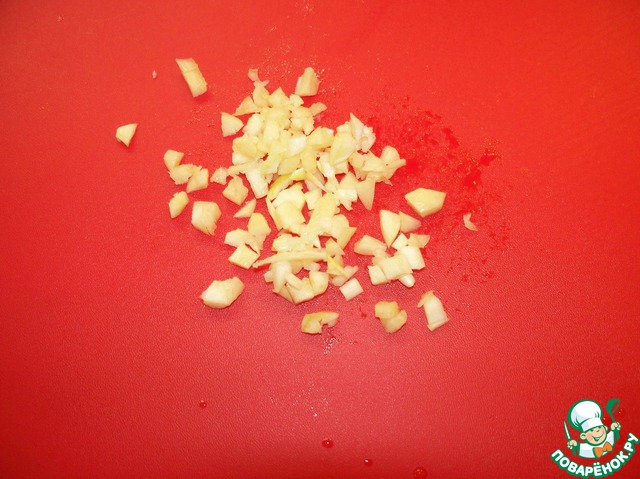 Чеснок мелко режем. Так написано в рецепте. На мой вкус, чеснок лучше не добавлять. Но, кому, что нравится.