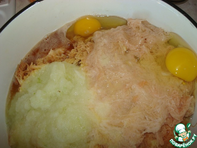 Лук чистим и трём на мелкой тёрке (приготовьтесь поплакать немного, но это полезно- фитонциды), добавляем в картошку. Туда же отправляем яйца.