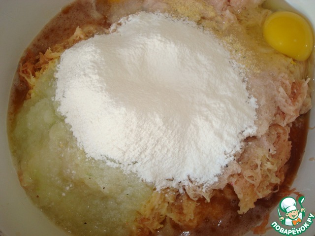 Сельдерей тоже трём и добавляем к оставшейся 1/3 теста