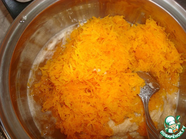 Тем временем тыкву чистим и трём на мелкой тёрке и добавляем к 1/3 части картофельного теста. Перемешиваем