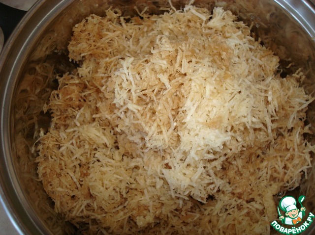 Картофель моем, чистим, трём на мелкой тёрке. Если жидкости много сливаем.