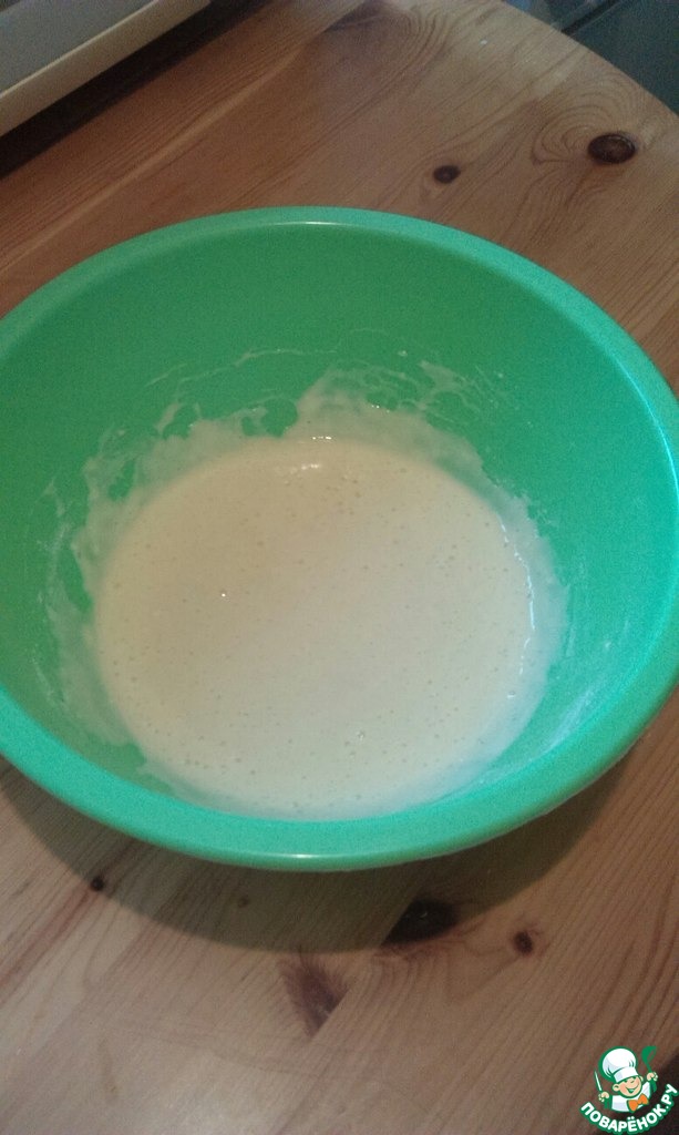 Перемешать: 2 яйца с солью. Добавить соду в кефир, размешать, добавить к яйцам. Далее добавить муку, хорошо вымешать.