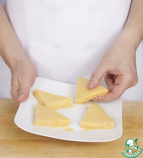 Нарезать хлеб кусками толщиной 1,5 см. Подготовить большую сковороду, положив масло и поставив ее на средний огонь. Окунать по 1 куску хлеба в яично-молочную смесь с обеих сторон, дожидаясь, пока хлеб впитает жидкость. Класть куски не на сковороду, а на чистую тарелку друг на друга – чтобы начали жариться одновременно.