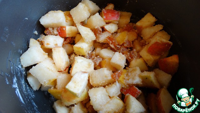 Чашу мультиварки смазываем маслом. Пересыпаем в нее фрукты, добавляем 2ст. л сахара, 2ст. л муки, мускатный орех, перемешиваем и даем настоятся 10 минут.