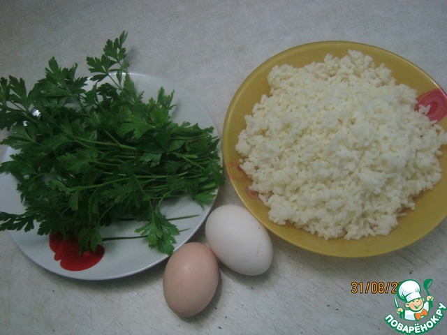 В рис добавляем яйца, порезанную мелко петрушку (если есть укроп то и его тоже) и приправу "КАРРИ" (фирма "Приправка")