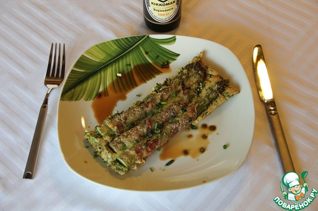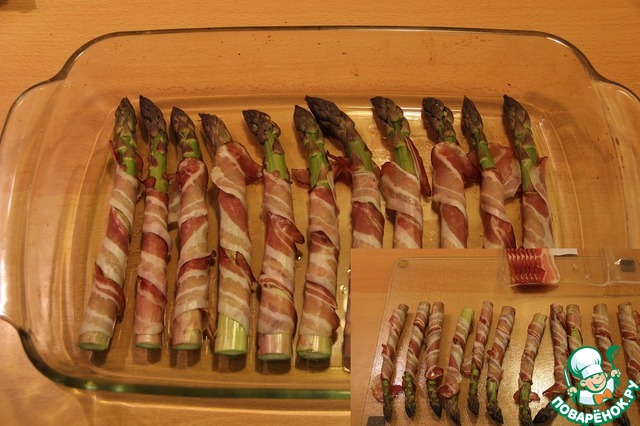 Каждую спаржу заворачиваем в бекон и укладываем в жароустойчивую форму, смазанную подсолнечным маслом.