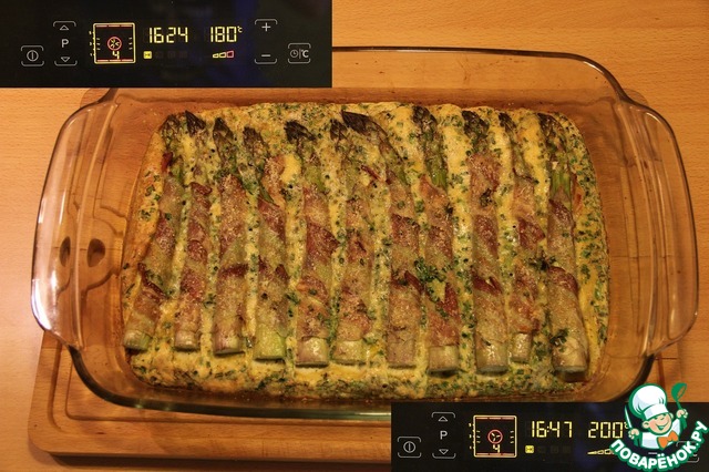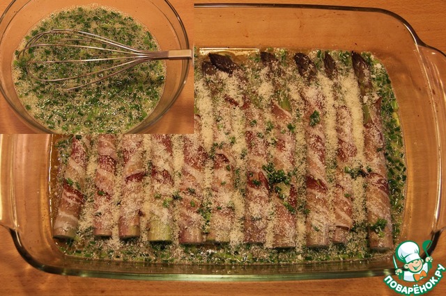 Заливаем полученной смесью спаржу и посыпаем тёртым пармезаном.