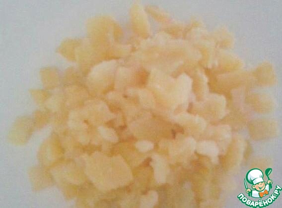Отваренный картофель режем на небольшие кусочки. Выкладываем к рыбе и овощам.