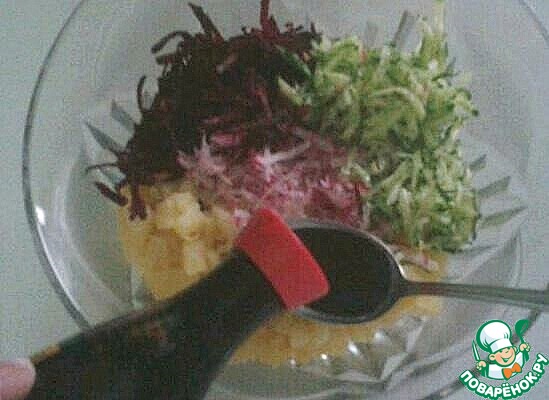 Огурцы, редис и свеклу ( сырую ) натираем на крупной терке. Кладем в емкость к рыбе.