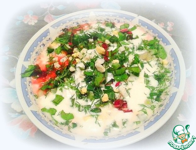 Кладем в тарелку замаринованные овоши и рыбу. Заливаем кисломолочной смесью. Украшаем рубленой зеленью с яйцом.