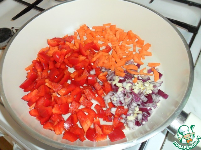 Лук, чеснок, морковь и перец мелко порезать. Разогреть в сковороде оливковое масло и обжарить овощи 5-7 мин.
