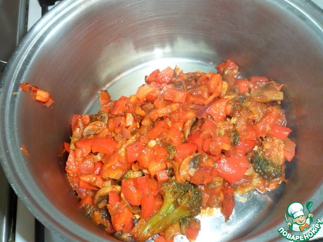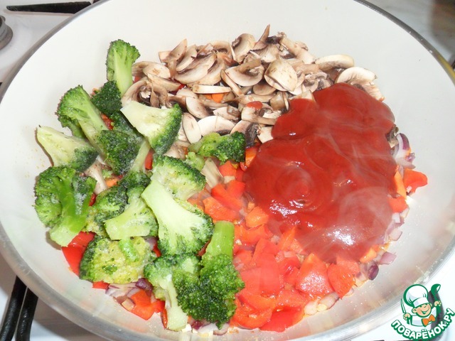 Добавляем к овощам нарезанные грибы, брокколи, кетчуп.