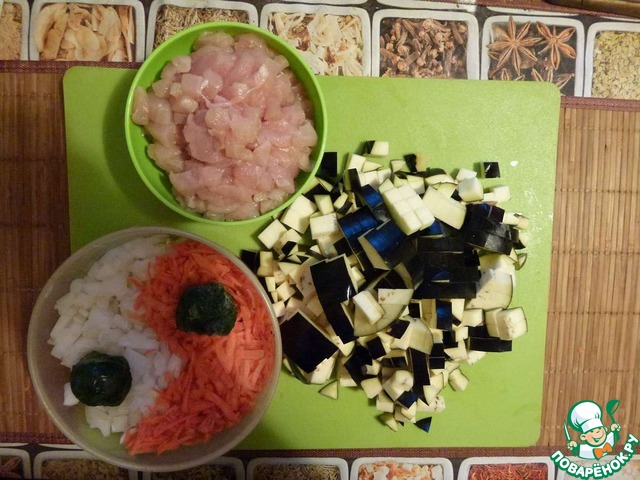 Нарезаем курочку, баклажан и лучок. Натераем морковь.