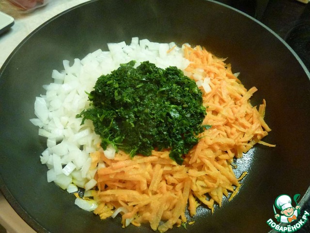 Выкладываем лук и морковь на разогретую сковородку, с сверху добавляем измельчённый в блендере шпинат. Пассеруем наши овощи...