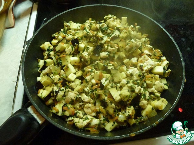 К овощам на сковородку добавляем то ради чего мы здесь собрались: курицу и баклажаны.