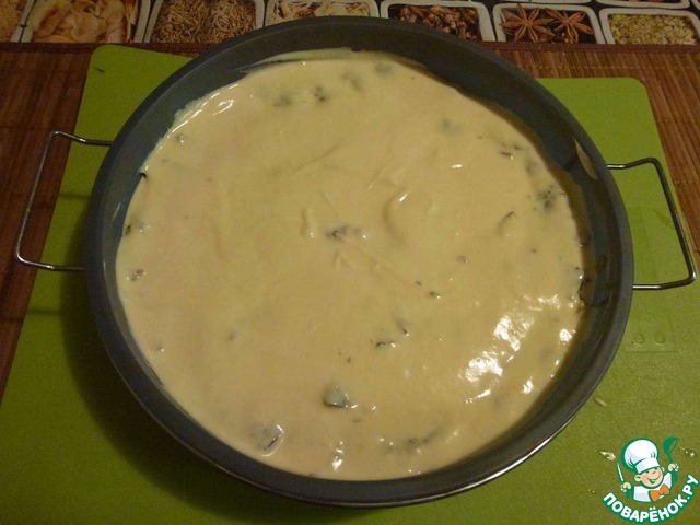 Берём ёмкость для запекания и выкладываем половину приготовленного теста. На тесто выкладываем подошедшую к готовности начинку.