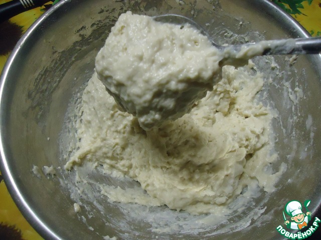 Всыпать муку смешанную с содой. Хорошо вымесить тесто, чтобы не было комочков. Тесто не должно быть слишком густое или жидкое.