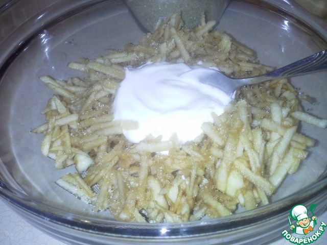 Яблоки очищаем и натираем на крупной терке. Посыпаем сахаром, добавляем сметану, перемешиваем. Яблочки потемнели - ничего страшного!