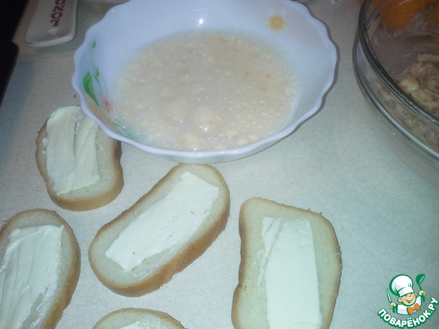 Каждый ломтик хлеба с одной стороны смазываем сливочным маслом. Молоко размешиваем с яйцом. Обмакиваем каждый кусочек хлеба в молоке и кладем масляной стороной на протвень, застеленный пекарской бумагой.