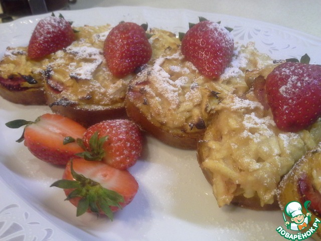 | Простой, быстрый, ароматный и очень вкусный ваш завтрак... или ужин... вам решать. Мои домашние очень любят гренки и любят яблоки, я люблю клубнику, вот и решила все совместить! На сайте есть похожий рецепт гренок, но он без фото совсем и был давно опубликован. Решила напомнить вам о таком простом и вкусном способе угостить своих домашних. |